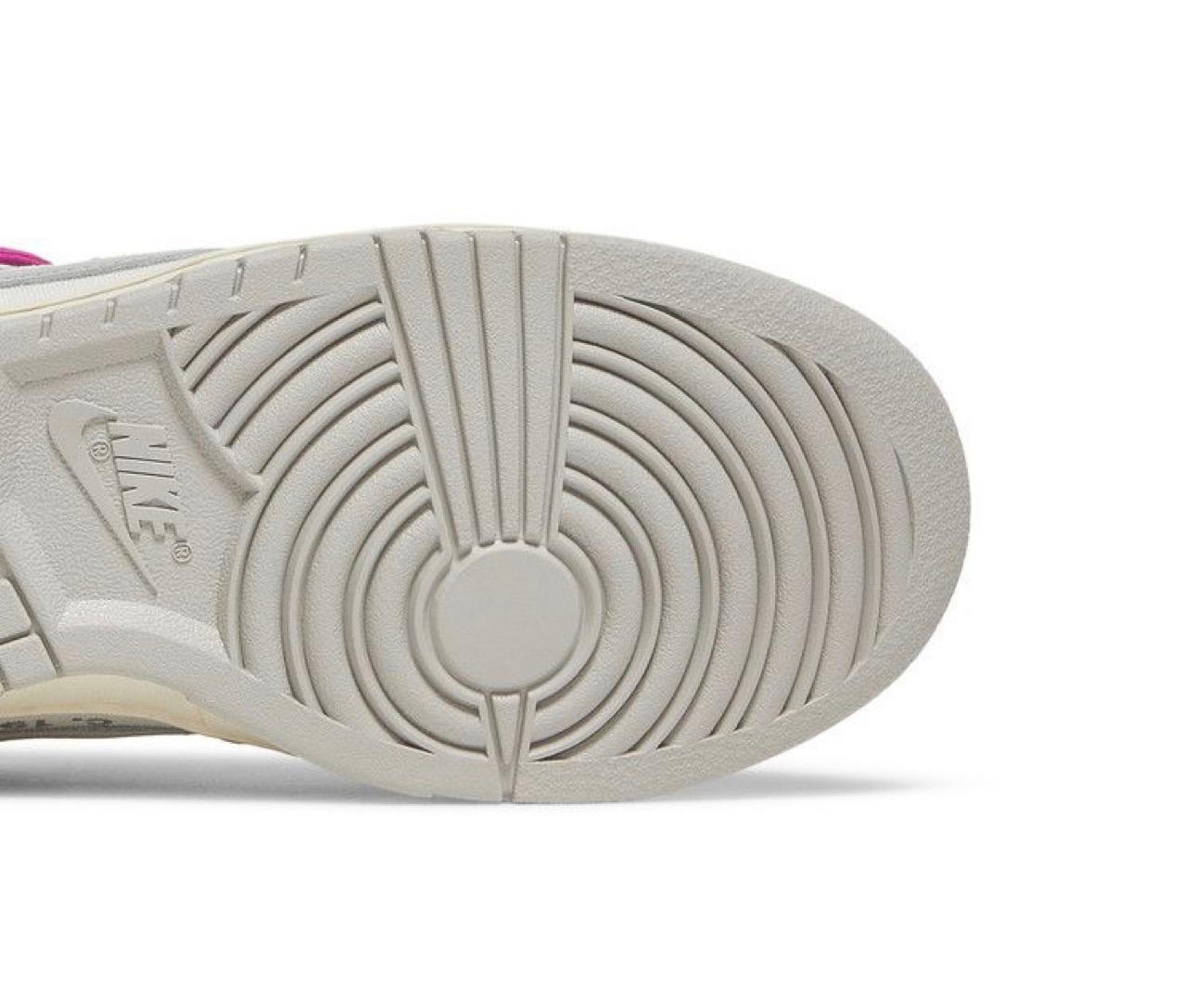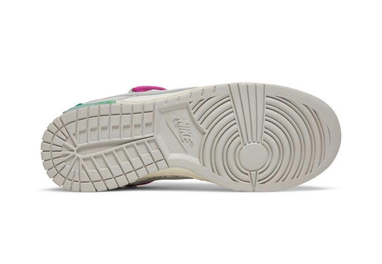 This Off-White x Nike Dunk Low is taken from the ‘Dear Summer’ collection, a sprawling follow-up to Virgil Abloh’s first Nike Dunk collaboration from 2019. The low-top makes use of a white leather upper with soft grey canvas overlays, along with Virgil Abloh’s calling-card flourishes, which include a plastic zip tie and printed Helvetica text. Contrasting pops of color arrive via the sneaker’s secondary lacing system, zip-tie, an exposed-foam tongue and a rectangular tab affixed to the Swoosh. Limited to fifty pairs, a ’30 of 50’ badge is affixed on the lateral midsole.